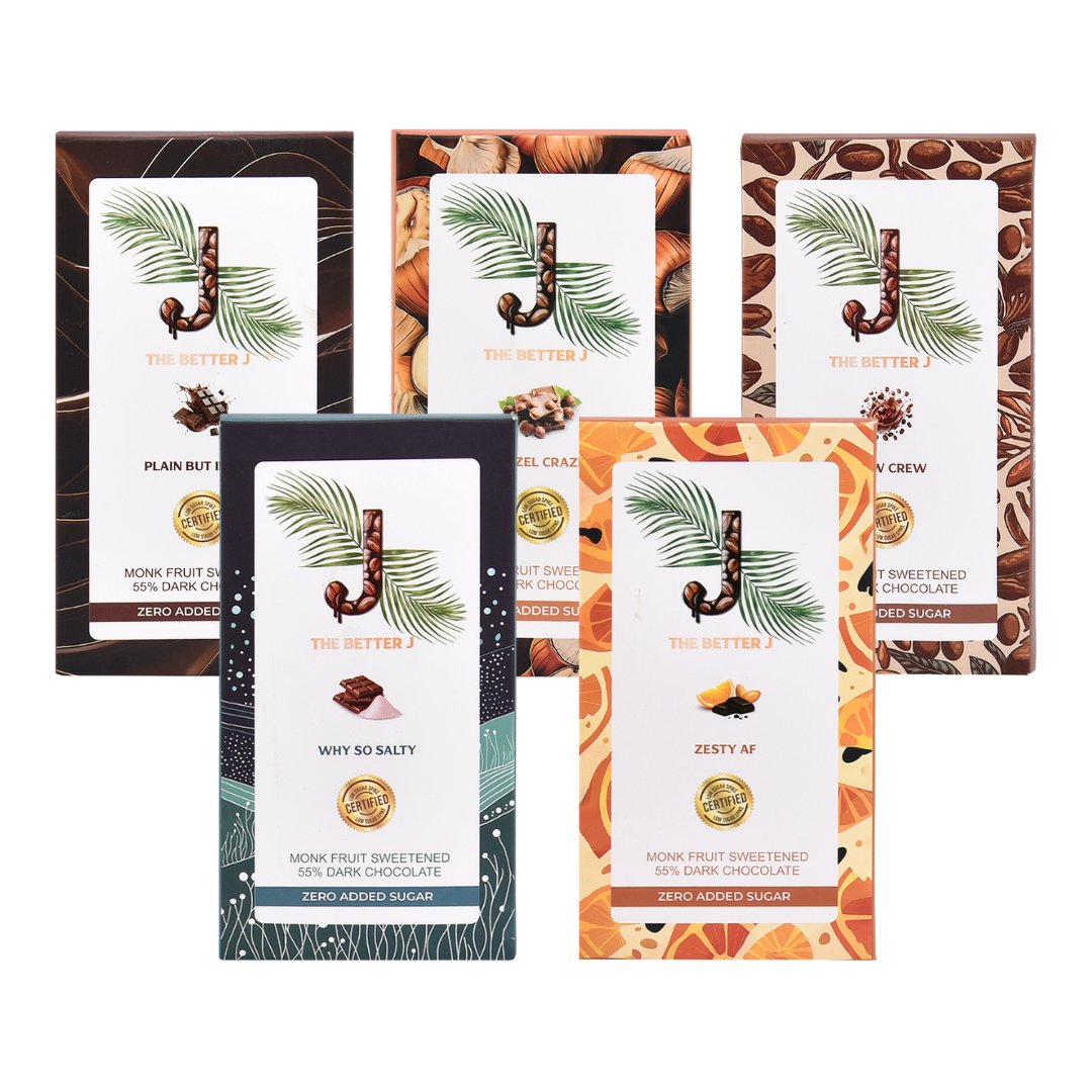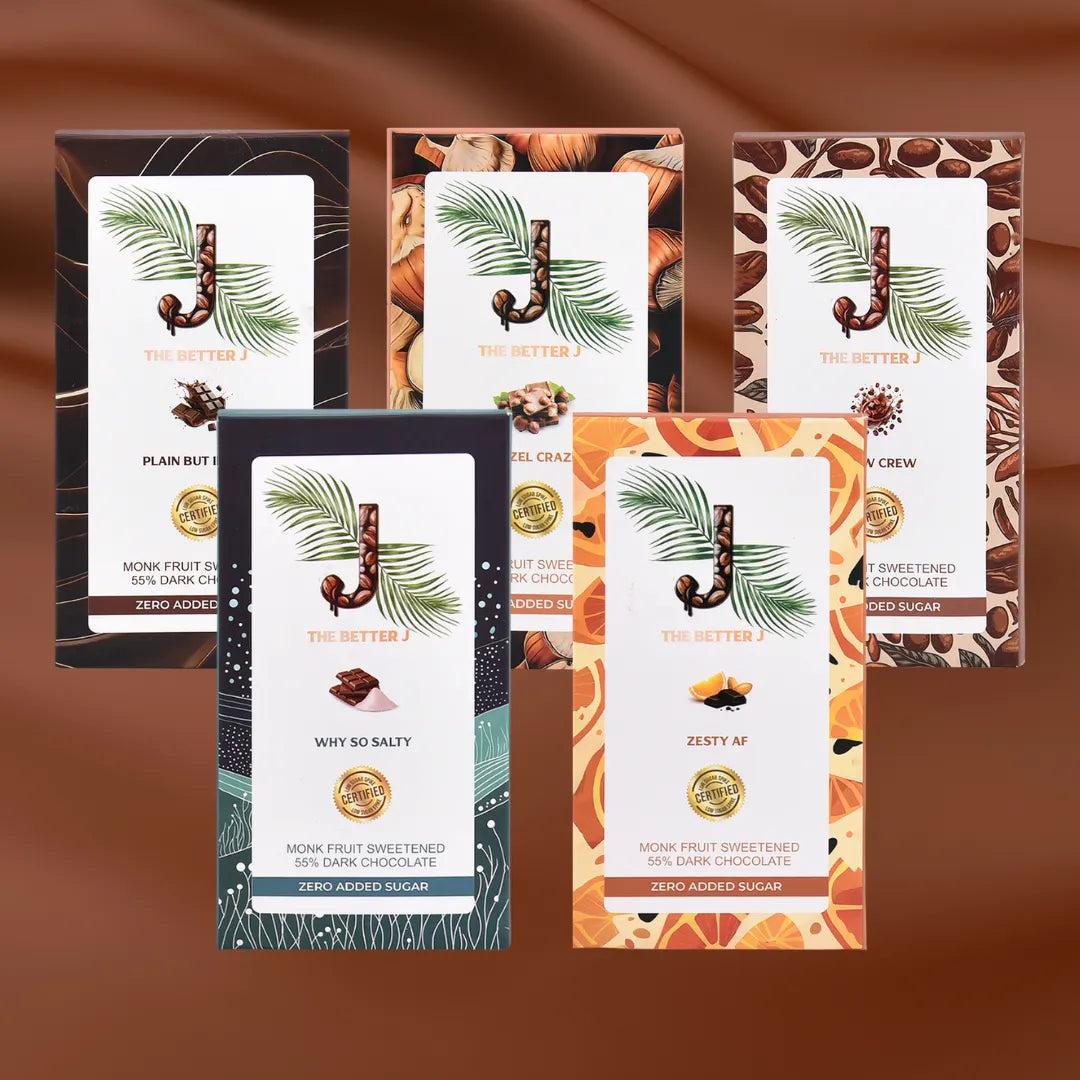 Experience the full expression of indulgence with The Quintessential Collection — five masterfully crafted bars that embody elegance, contrast, and creativity. From the timeless charm of pure cocoa to the daring twist of sea salt, the citrus brilliance of orange and almond, the comforting richness of hazelnut, and the bold sophistication of espresso — each bar tells a story of balance, depth, and artistry.